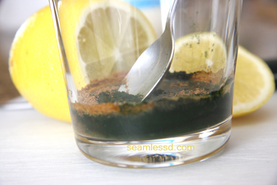 • I then drank a cup of water with half a teaspoon of camu camu berry vitamin C (not cheap!), 1 teaspoon Chlorella powder (any quality greens powder would be comparable), and made it taste good with lemon juice & couple drops stevia natural sweetener.
