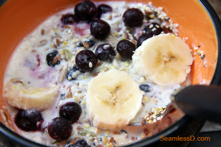 Kefir poured over raw seed-based cereal with raisins, blueberries, & bananas. And you thought you’d never see a bowl of cereal again.